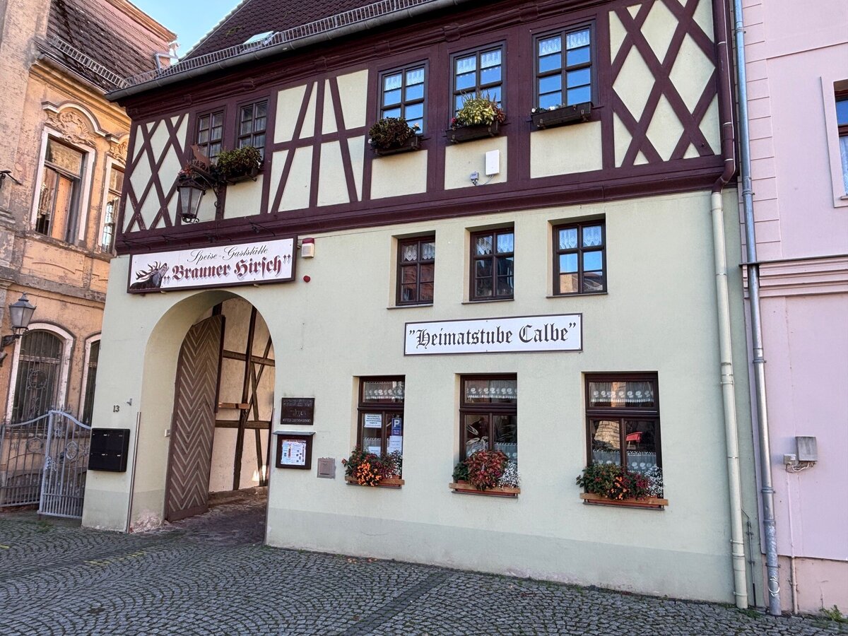 Am Marktplatz steht die älteste noch betriebene Gaststätte Calbes. Das durch den Dreißigjährigen Krieg verwüstete Gebäude wurde 1653 zu günstigen Bedingungen, die der Rat für den Wiederaufbau solcher Häuser vergab, als Gasthof am Markt, später unter dem Namen „Brauner Hirsch“, neu errichtet. Dieser Gasthof war quasi ein „Motel“ für durchreisende Händler mit ihren Fuhrwerken. Der große Hof für die Wagen und die anliegenden Ställe für die Pferde sind gut zu erkennen. Im Erdgeschoss des Gebäudes befindet sich die aus dem 17. Jahrhundert stammende, gern besuchte Gaststätte, die immer noch „Brauner Hirsch“ heißt. In den darüber liegenden ehemaligen Herbergsräumen ist die „Heimatstube Calbe (Saale)“ untergebracht.