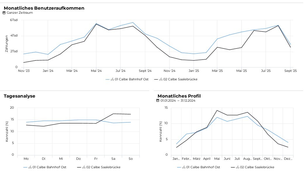 Die erfassten Daten werden in regelmäßigen Abständen aktualisiert, sodass aktuelle Entwicklungen und Trends im Radverkehr transparent nachverfolgt werden können. Sie dienen als wichtige Grundlage für die Planung von Radwegeinfrastruktur, touristische Angebote und Maßnahmen zur Förderung des umweltfreundlichen Radverkehrs in und um Calbe (Saale).