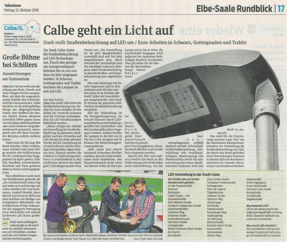 Bereits seit über zwei Jahren arbeitete die Stadt an der Vorbereitung und erhielt dabei auch tatkräftige Unterstützung von der Landesenergieagentur (LENA) Sachsen-Anhalt. Wirtschaftlichkeitsüberprüfung, Entwicklung von Projektunterlagen, Beantragung von Fördermitteln sowie die Ausschreibung des ersten Bauabschnittes nahmen erhebliche Zeit und Kraft in Anspruch. „Am 26. Februar 2018 erhielt die Stadt Calbe (Saale) den Zuwendungsbescheid aus Mitteln der Nationalen Klimaschutzinitiative zur Umstellung der Straßenbeleuchtung auf LED, gefördert durch die Bundesrepublik Deutschland, wo als Zuwendungsgeber das Bundesministerium für Umwelt, Naturschutz und Reaktorsicherheit aufgrund eines Beschlusses des Deutschen Bundestages agiert“, so Hause weiter.