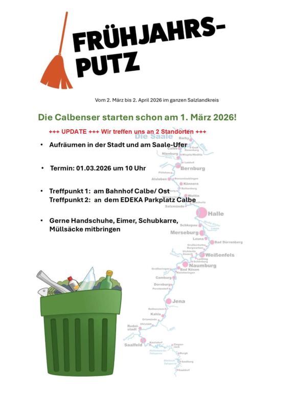 Während der offizielle Aktionszeitraum im gesamten Salzlandkreis vom 2. März bis 2. April 2026 stattfindet, legen die Calbenser bereits einen Tag früher los: Am 1. März 2026 um 10 Uhr startet eine groß angelegte Aufräumaktion in der Stadt sowie entlang des Saaleufers.