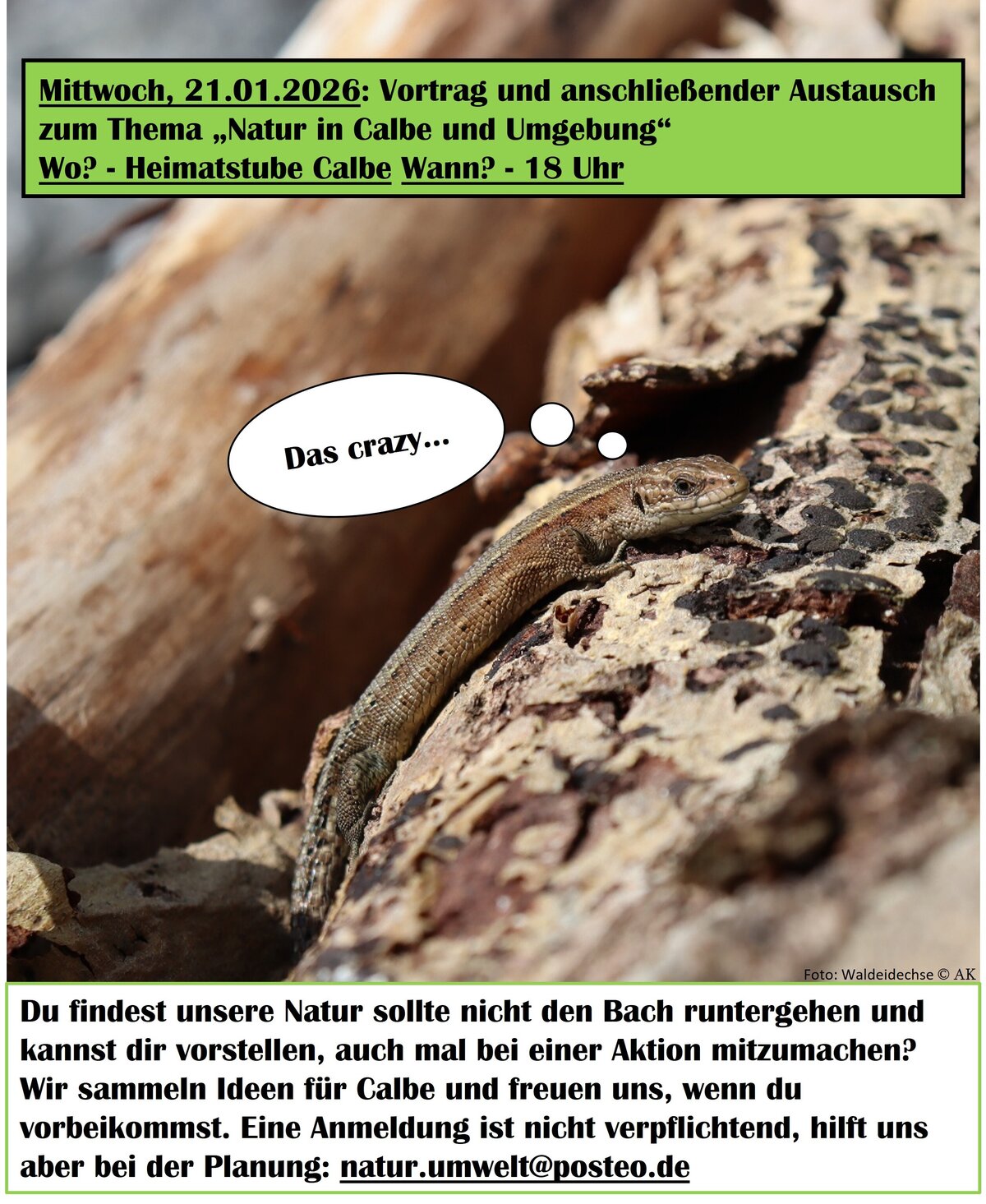 Du findest unsere Natur sollte nicht den Bach heruntergehen und kannst dir vorstellen, auch mal bei einer Aktion zu unterstützen? Wir sammeln Ideen für Calbe und freuen uns, wenn du vorbeikommst. Eine Anmeldung ist nicht verpflichtend, hilft uns bei der Planung : natur.umwelt@posteo.de