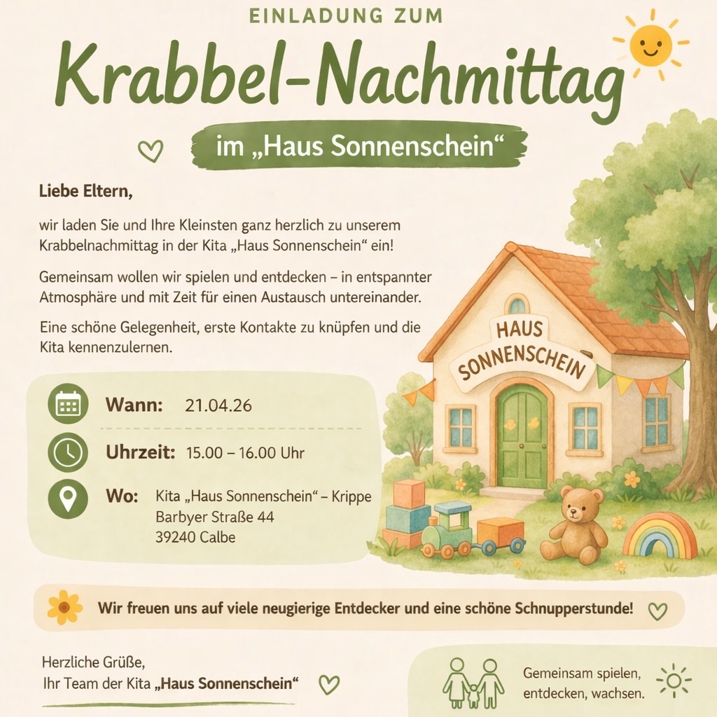 wir laden Sie und Ihre Kleinsten ganz herzlich zu unserem Krabbelnachmittag in der Kita »Haus Sonnenschein« ein!